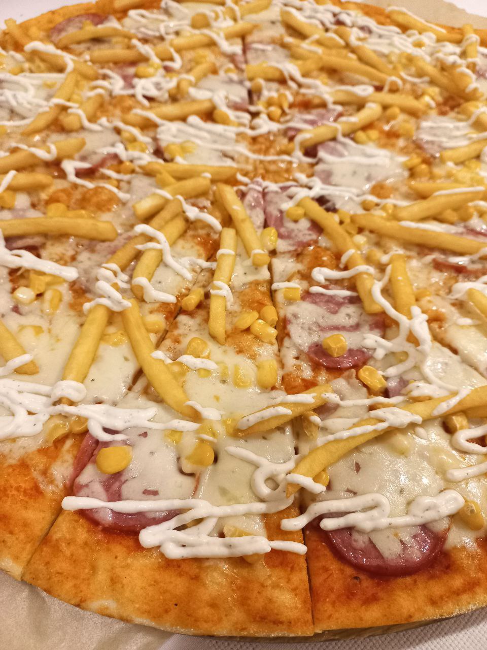 огірок консервований, салат айзберг, сир "Чедер", соус гірчичний, кетчуп, картопля фрі. Вихід: 200/70/40 г.