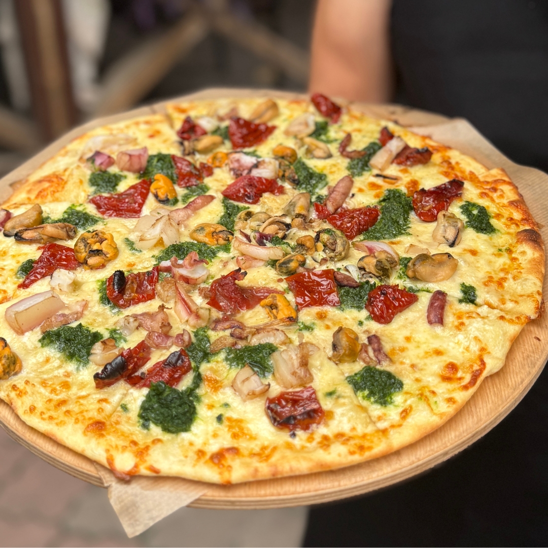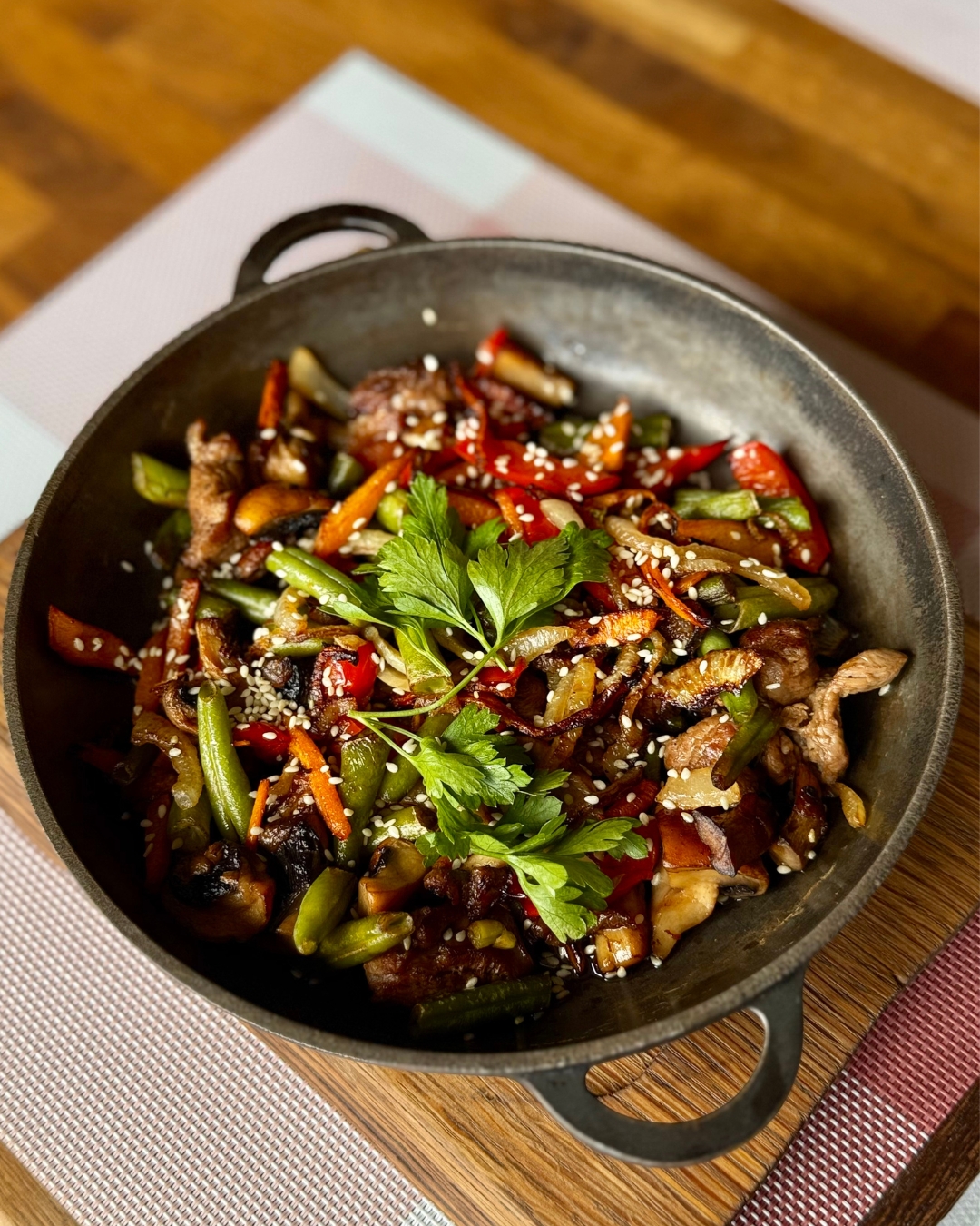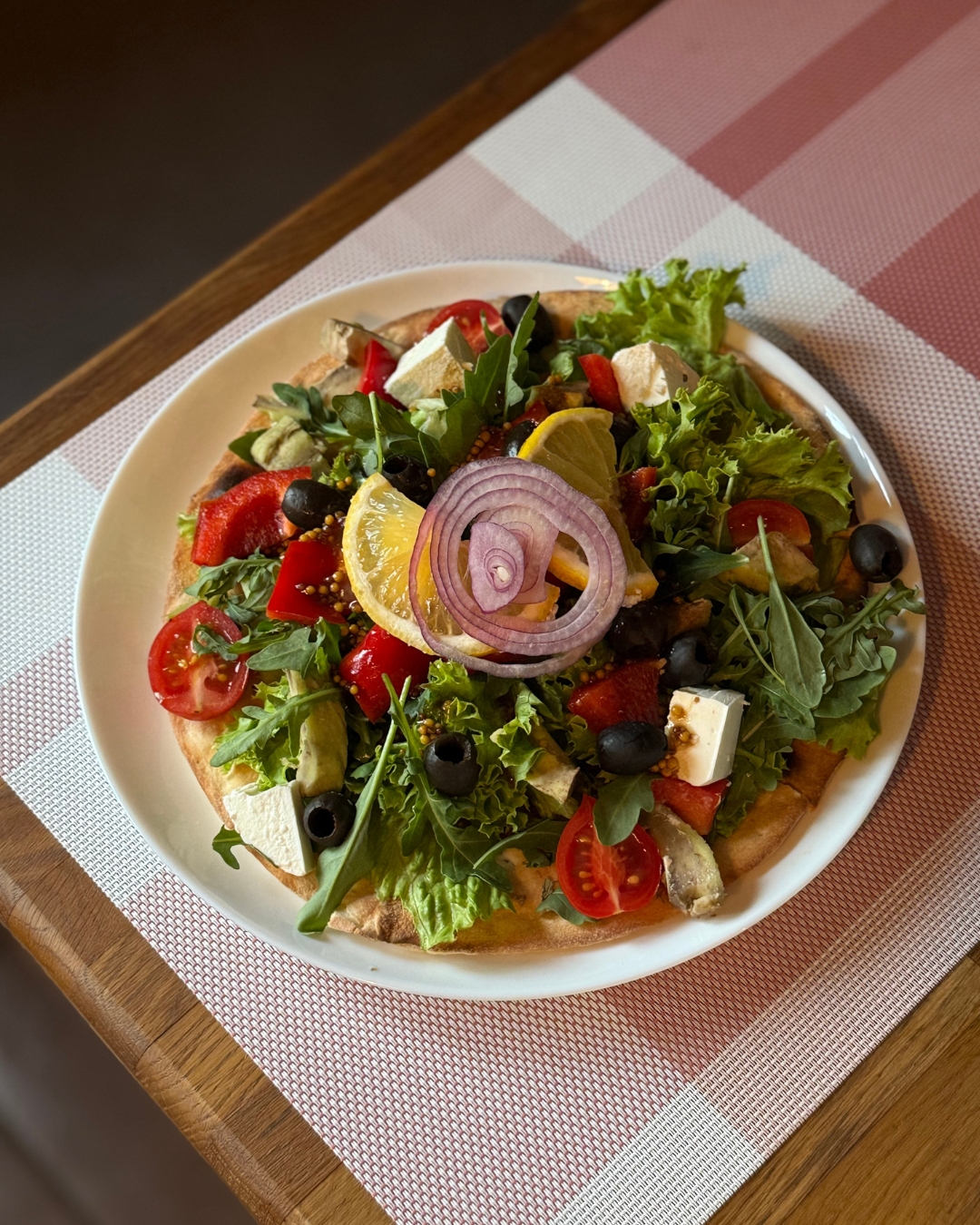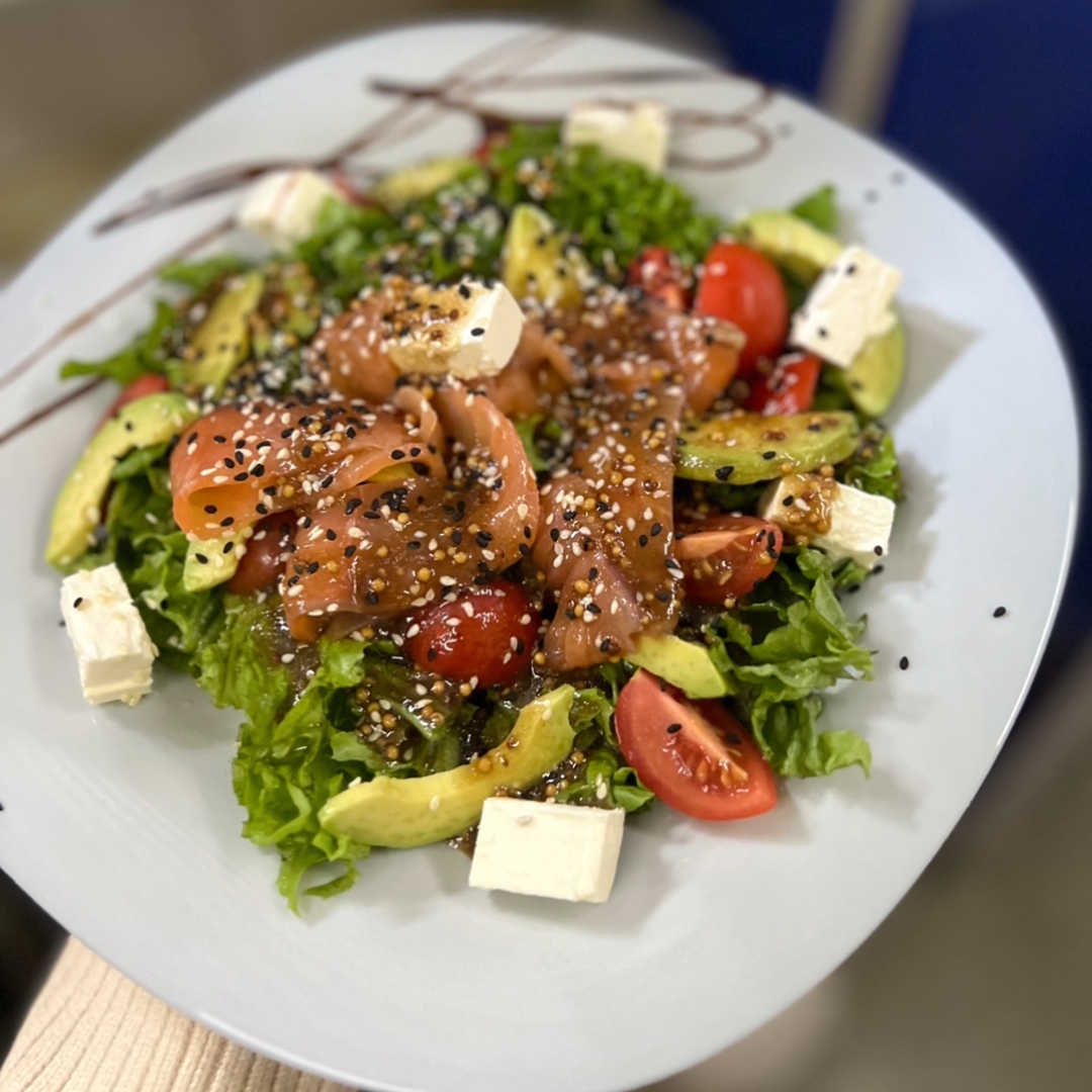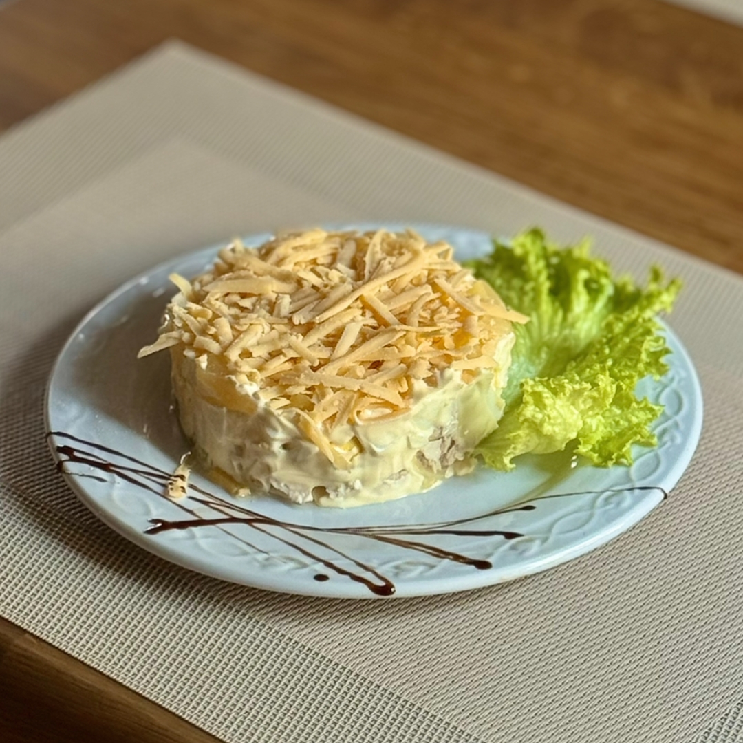 салат айзберг, томати, ананас консервований, соус кисло-солодкий, кетчуп. Вихід: 180 г.
